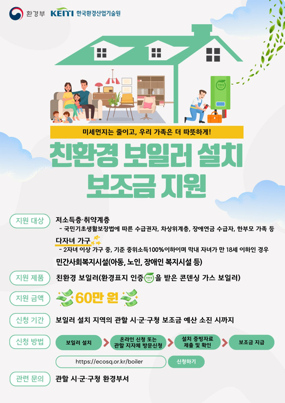 보일러 제조사(예: 경동나비엔, 귀뚜라미, 린나이 등)의 모든 보일러가 지원 대상은 아닙니다. 반드시 환경표지 인증 제품인지 확인해야 보조금 지급이 가능합니다.