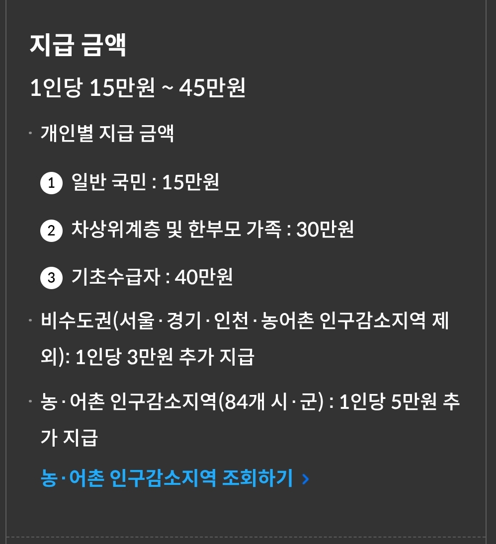 기본 지급액은 15만 원부터 시작되며, 소득 수준, 가구 구성, 지역별 우선 지원 여부에 따라 최대 55만 원까지 차등 지급됩니다.